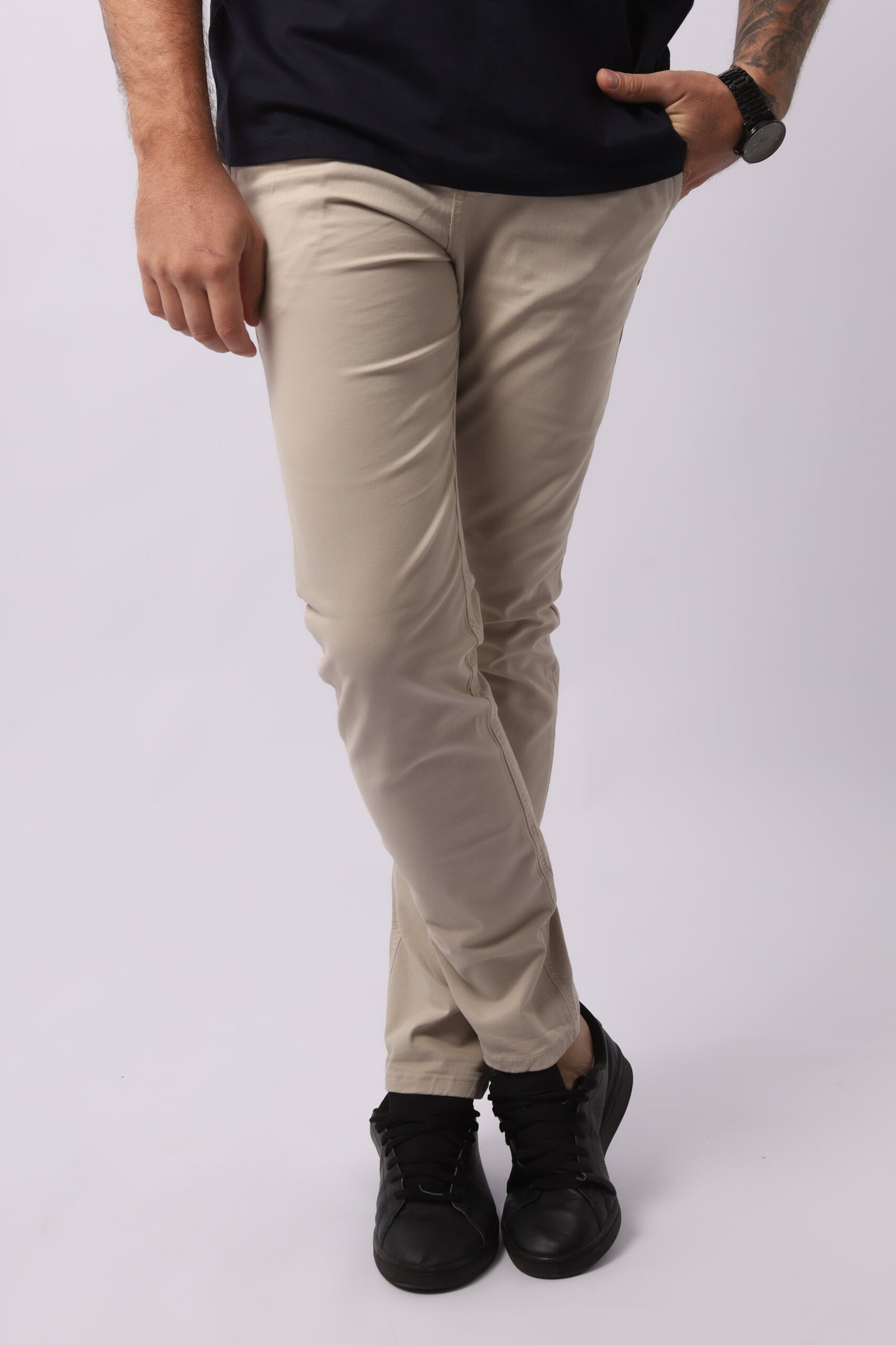 A CALÇA SLIM ELEMENTAR com elastano, peletizada e com acabamento de cetim, possui toque macio, levemente aveludado e com brilho natural.