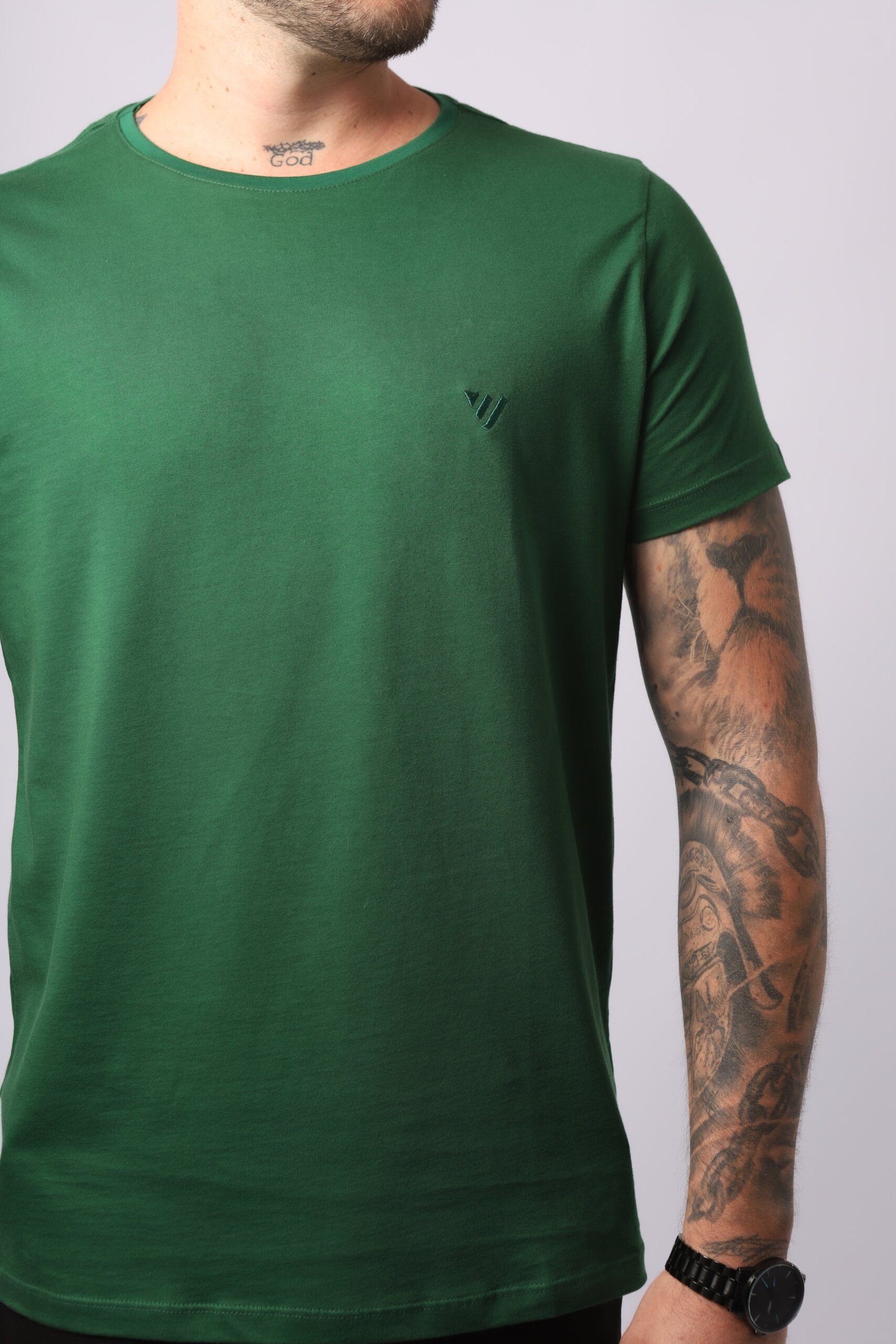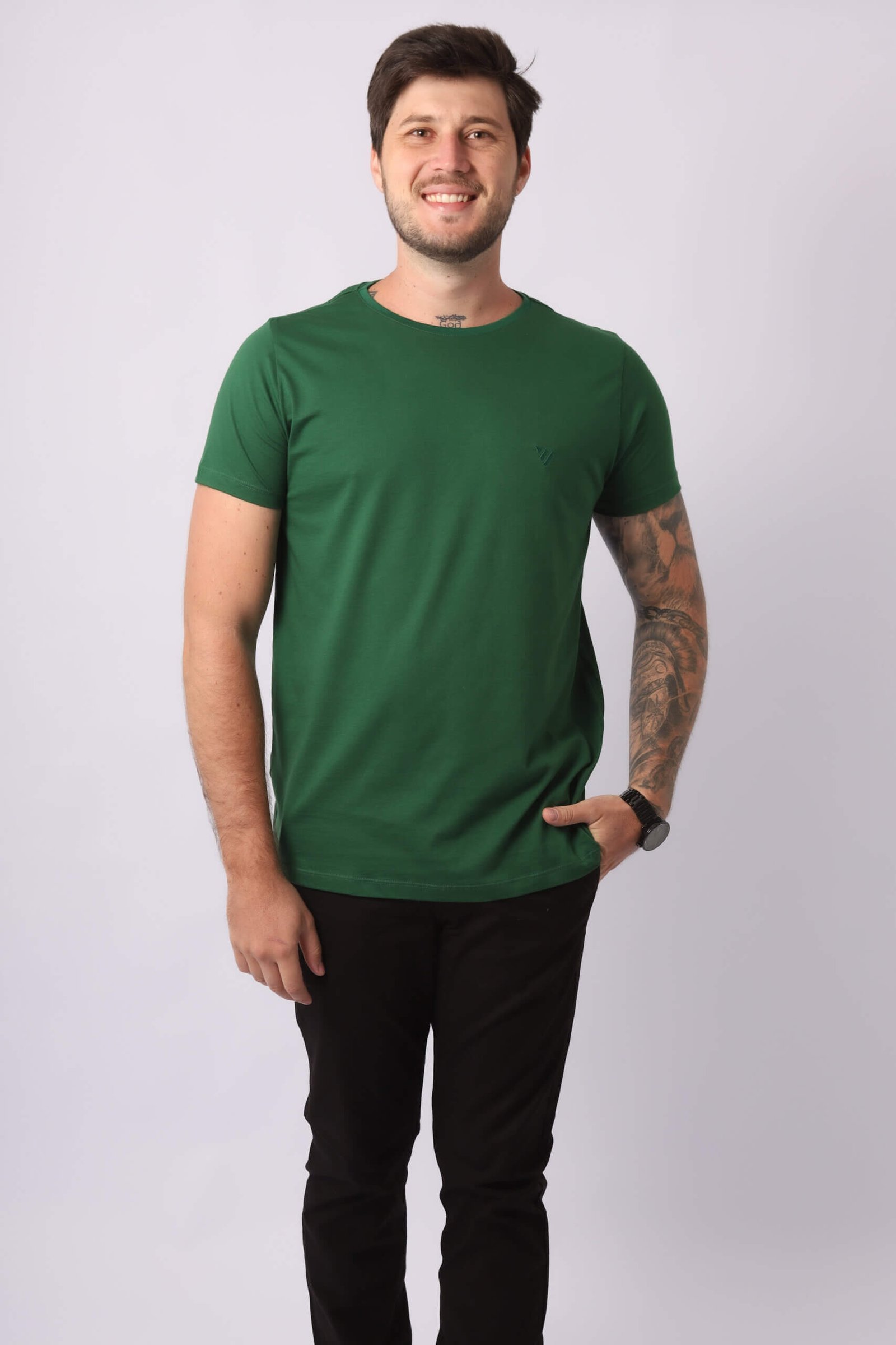 Gola redonda estruturada com reforço interno ombro a ombro.