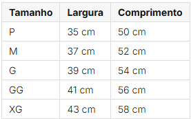Tabela de Medidas: